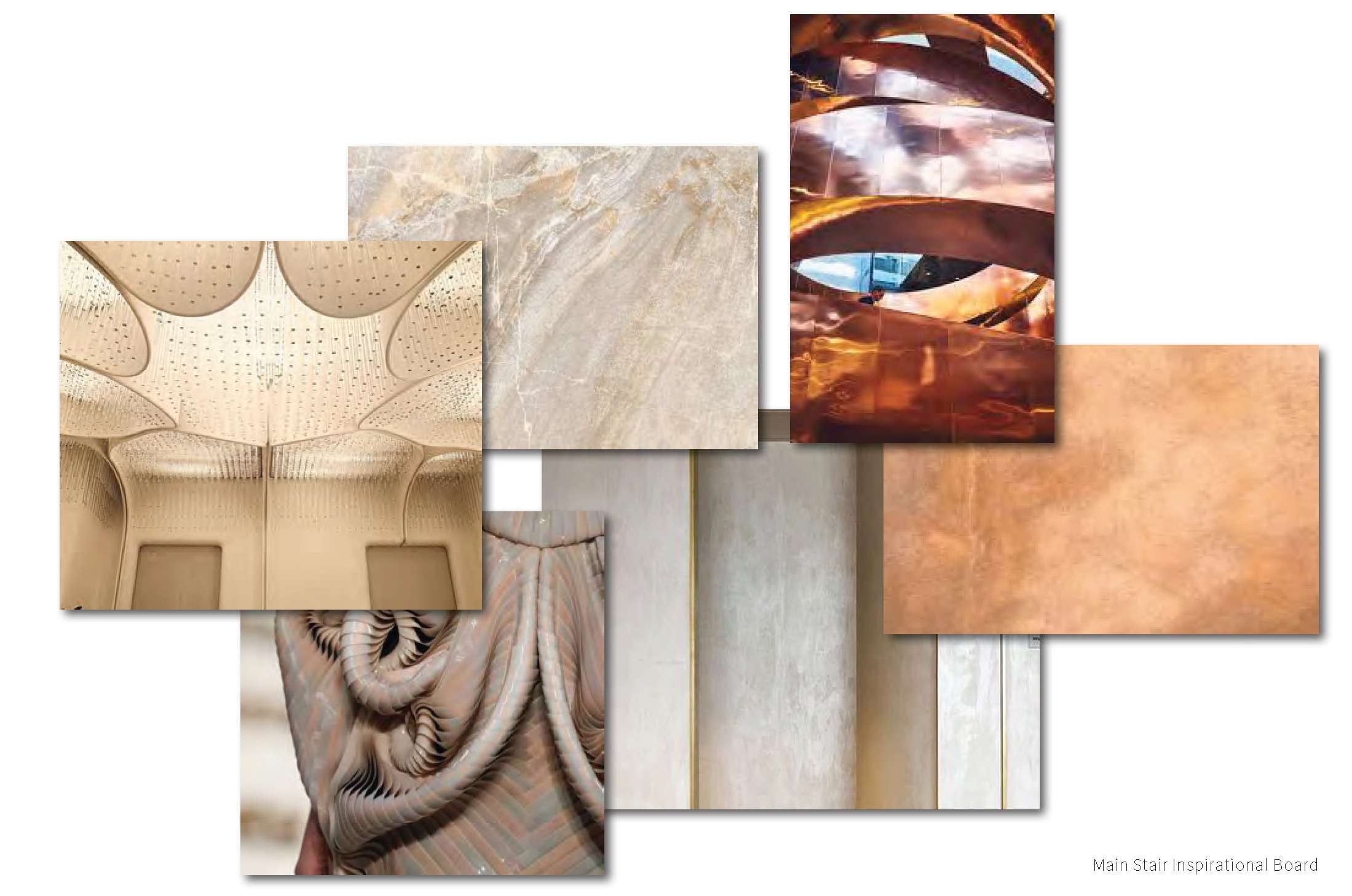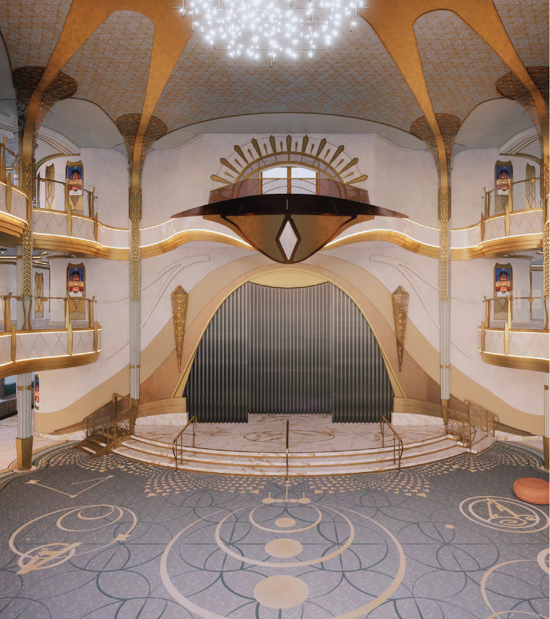 The futuristic forms, gilded columns, and soaring, ribbon-like stairs are inspired by the hope for the future, paired with the duality of the ancient. Layers of ornament and patterns tell a story of the people, of what has been and what is to come.